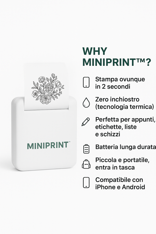 MiniPrint™ è la stampante portatile che ti permette di stampare note, foto, checklist e disegni in pochi secondi direttamente dal tuo smartphone. Grazie alla tecnologia di stampa termica, non utilizza inchiostro: niente cartucce da cambiare, zero sprechi e massima comodità.